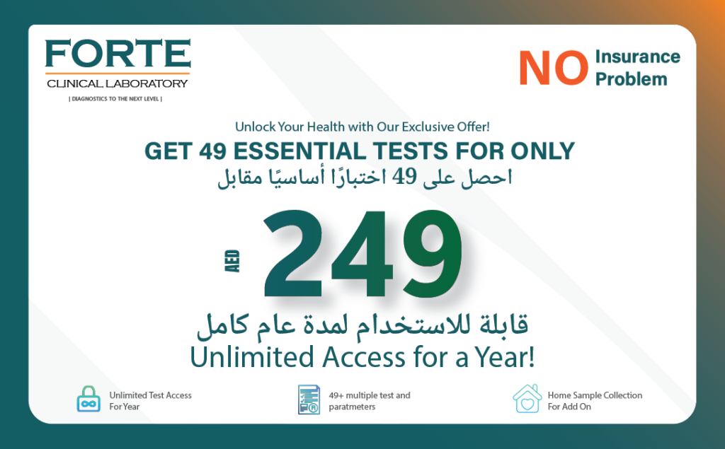 Take control of your well-being with Forte Clinical Laboratory’s unbeatable offer: 49 essential diagnostic tests for just AED 249, with unlimited access for a full year—no insurance needed!